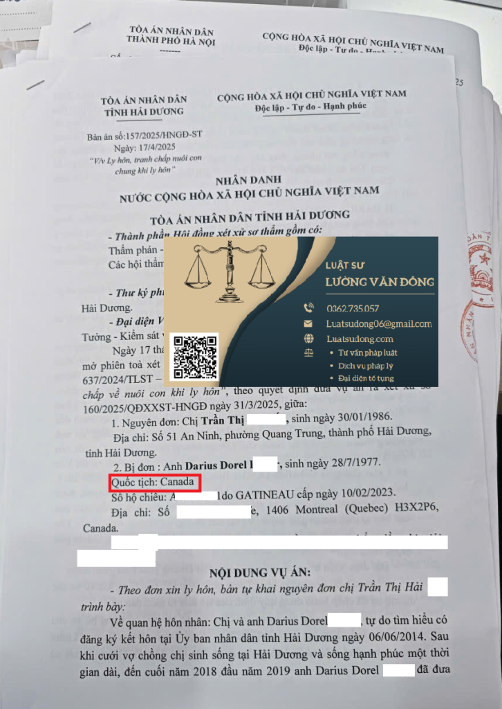Luật sư giải quyết ly hôn yếu tố nước ngoài tại Hải Dương. Hải Dương là một trong những địa phương có số lượng lớn người Việt Nam sang nước ngoài làm việc, chủ yếu là sang Đài Loan và Nhật Bản. Có những địa phương Luật sư đến xác minh và thủ thập chứng cứ chỉ thấy toàn người lớn và trẻ nhỏ. Được nhiều khách hàng tin tưởng nên Luật sư thường xuyên có khách hàng ở Hải Dương nhờ hỗ trợ thủ tục ly hôn có yếu tố nước ngoài, chủ yếu là người này giới thiệu cho người kia. Quá trình giải quyết nhiều anh chị chưa nắm được quy định của pháp luật về thủ tục Ly hôn có yếu tố nước ngoài nên trong phạm vi bài viết này, Luật sư Đông sẽ cung cấp cho anh chị những thông tin cần thiết về quy trình giải quyết thủ tục ly hôn có yếu tố nước ngoài.